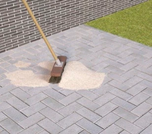 Après la pose des pavés et avant le damage, brossez-les immédiatement avec du sable de quartz blanc pur 0/1 ou du sable bio.